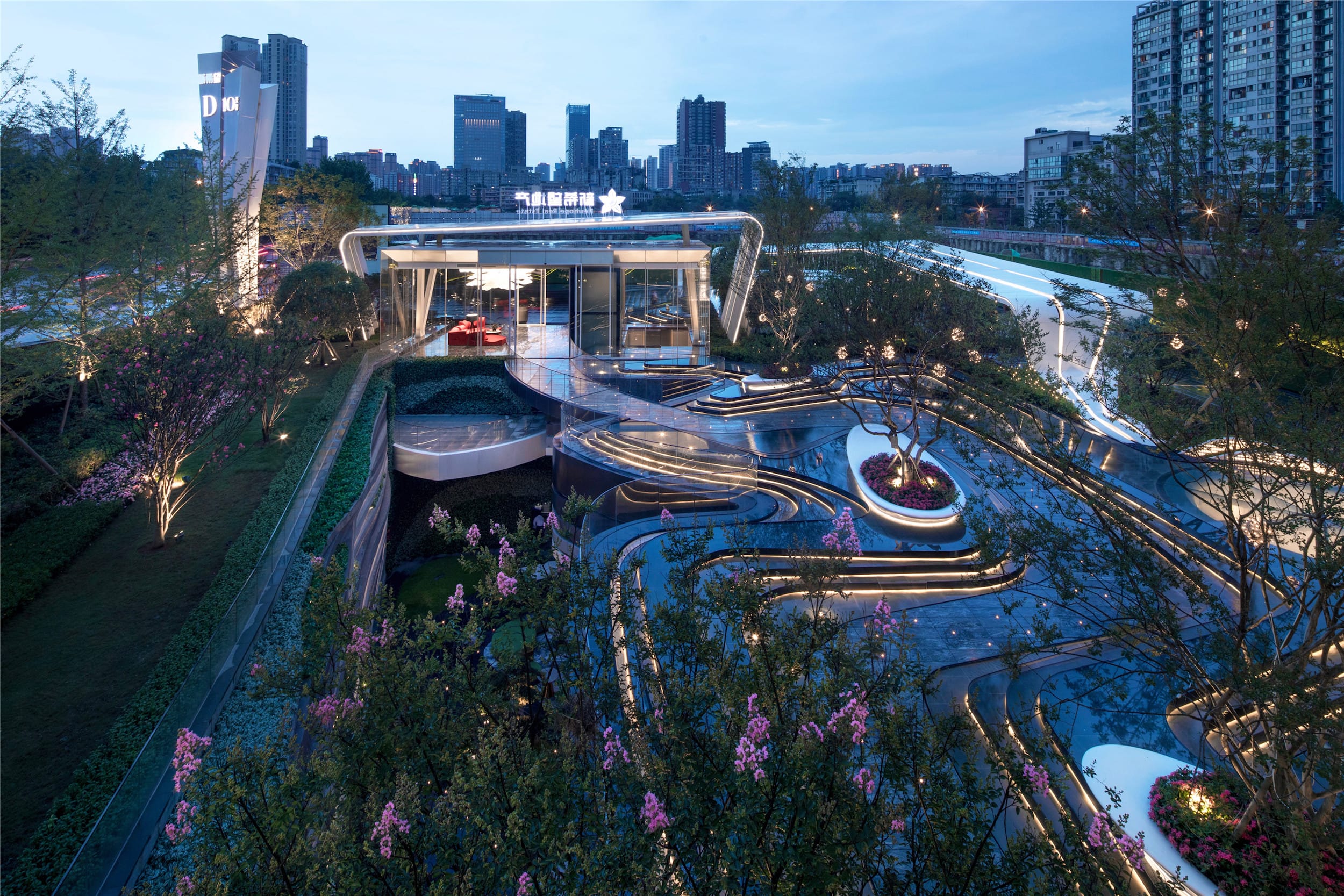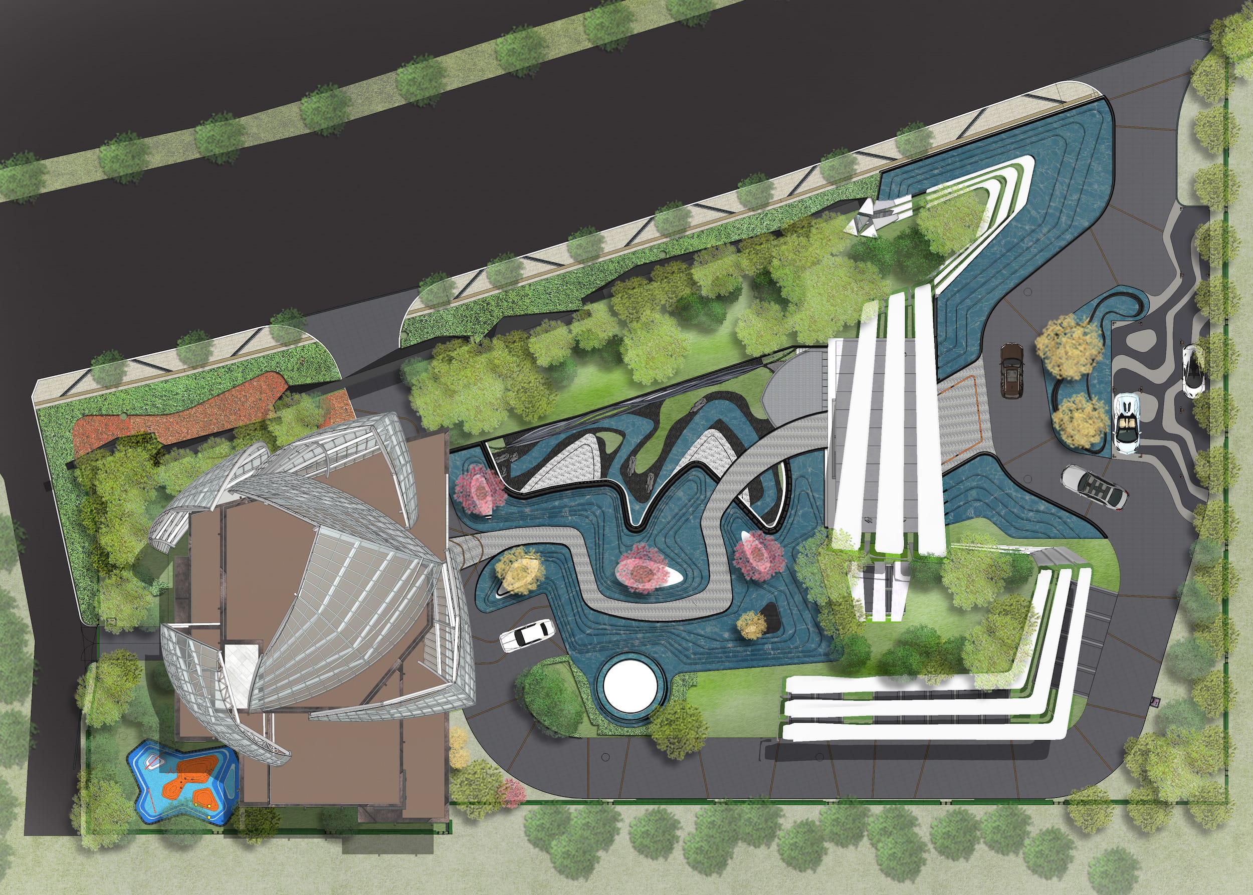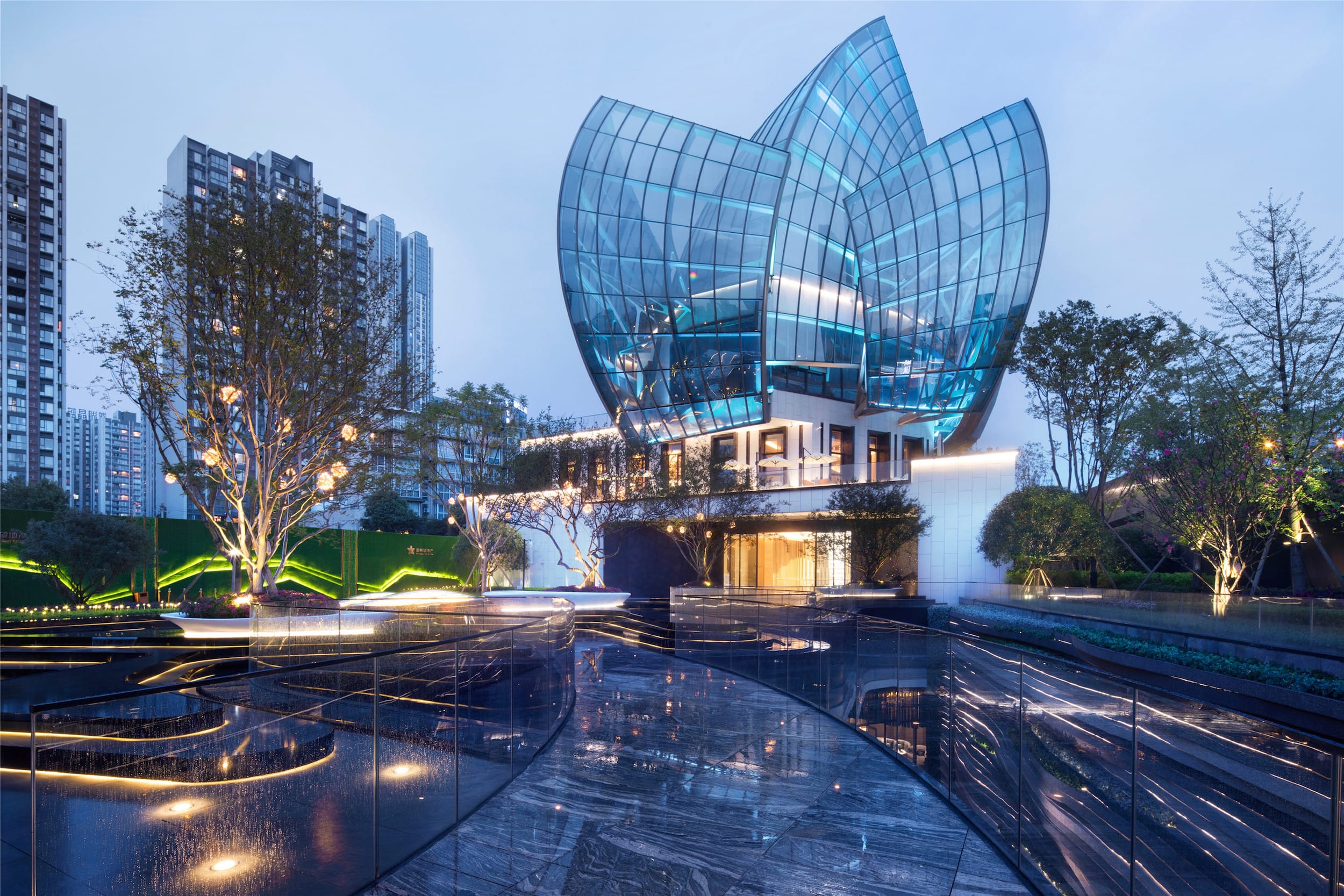 通過科幻感與自然感的和諧營造,體現(xiàn)未來城市花園的前衛(wèi)性。景觀與建筑和諧統(tǒng)一,各個元素相呼應、未來感的幾何切面和曲線,自然空間中存在的水、光、云、風、花、谷等元素,被轉換為摩登意象里的景觀語言,創(chuàng)造出一個未來生活的藝術花園秀場。